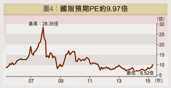圖4是國指的預期PE圖,2007年10月最高達28.35倍,2014年1月最低跌至6.52倍,現時只有9.97倍。