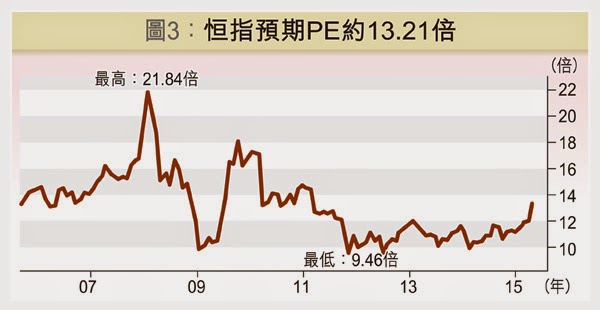 圖3是恒指的預期PE圖,2007年10月最高達21.84倍,2011年9月最低跌至9.46倍,現時只有13.21倍。