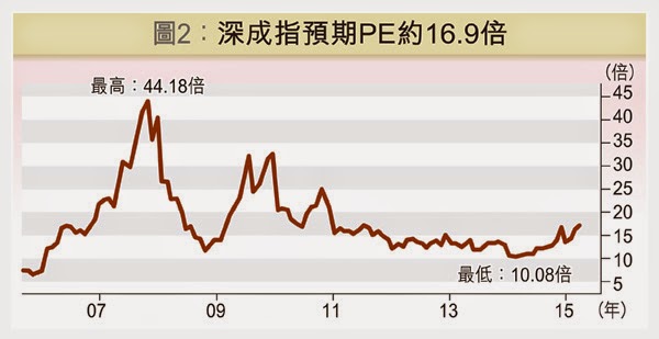 圖2是深證成分股指數的預期PE圖,2007年10月最高達44.18倍,2014年3月最低跌至10.08倍,現時只有16.9倍。