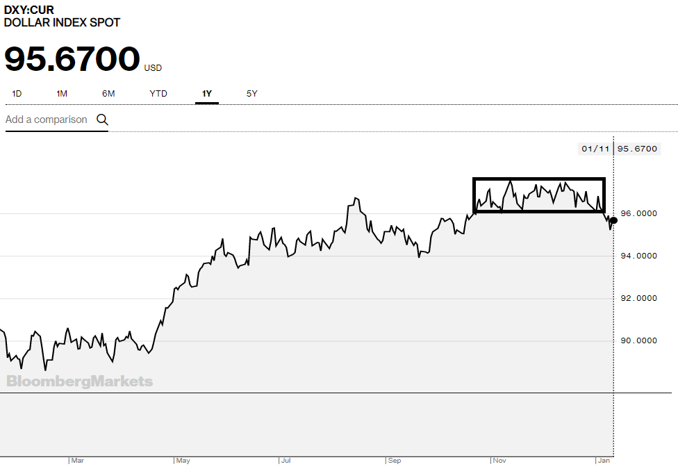 那麼看新興市場股市近月走向,以Emerging Markets ETF作代表,股價自12月下旬見底反彈,但未升穿近月阻力。