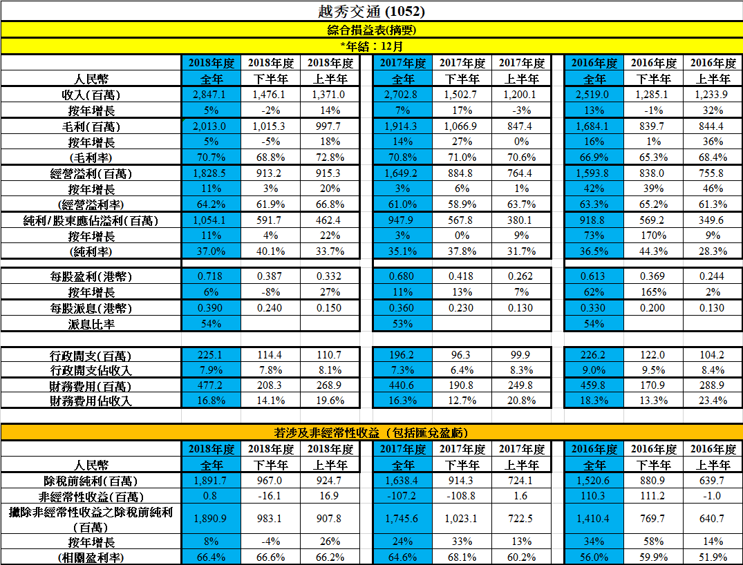 1月22日文章已「進可攻,退可守之選」為題,介紹的是越秀交通(1052),本週一公布全年業績,財務分析摘要如下