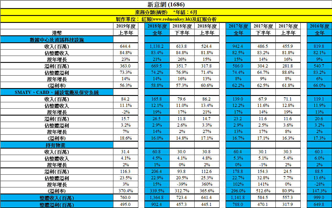 不過,週五收市後公布的中期業績會帶來怎樣的影響?下列財務分析摘要可見,收入按年升18%,不錯,但毛利率卻仍持續下跌,加上營運開支佔收入比率增加,令每股盈利(不包括投資物業公平值變動之影響)按年升7%至$0.08,雖然按慣例不派中期息,但全年此數據相等於每股派息,而按過往兩年全年數字等於上半年的$2.04計,可推測全年每股派息為$0.163,比現時唯一跟進的投行DBS預測的$0.17低。明白可能入賬時間或可能令下半年業績比過往佔比多,但因已提取大額貸款作剛投標成功的另一塊將軍澳數據中心前期支出,利息支出也會相對增加。
