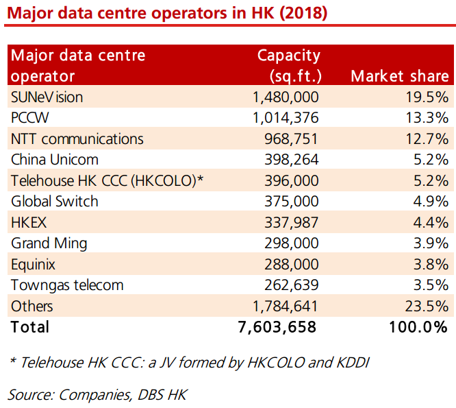 報告亦提到香港數據中心在2018年尾的總樓面面積(Gross Floor Area – GFA)約760萬平方呎,使用率約80%,剩餘容量預期會在未來兩三年完全給應用。以GFA計,新意網佔全港19.5%,拋離第二位PCCW的13.3%。