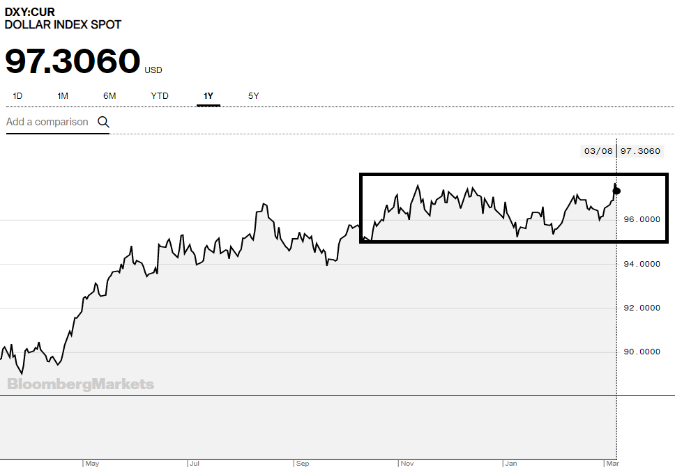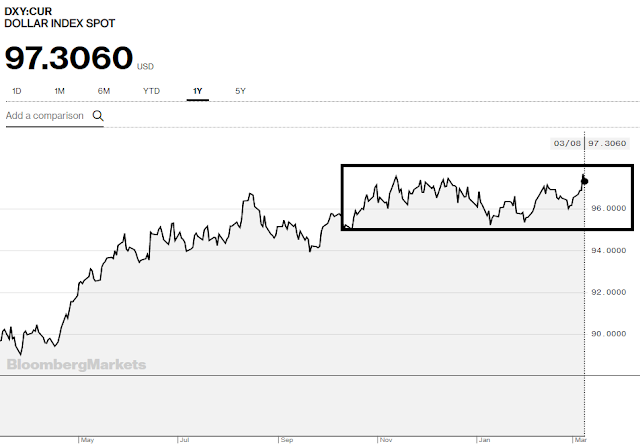 資金是否從新興市場流走,還是先看美元,美匯指數去年11月升不破97.5後,便一直徘徊不前,週四曾升破97.5至97.7後,市場有點擔心美匯指數會否重拾升勢,令資金從新興市場流返美國。若計2月26日至3月8日,美匯指數升了1.39%,不過亞洲貨幣指數只下跌了0.61%,而歐羅兌美元則下跌了1.47%,似乎美元近日較強,歐洲重啓放水下的歐羅弱勢,貢獻較大。至於同期人民幣,兌美元只下跌了0.27%。