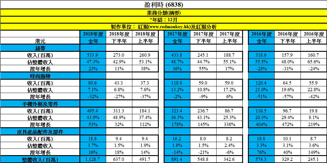 可是,留意上表的話,可見2016年收入及盈利呈倒退,此為小型增長股業績不穩定性的風險。看下表不同業務的收入,當年主業錶帶呈倒退,其後重拾升勢;時尚飾物當年倒退更大,重要性開始下降;手機外框及零件當年剛起步,未能抵銷其他業務的跌幅,但其後持續高增長,去年重要性已貼近錶帶。