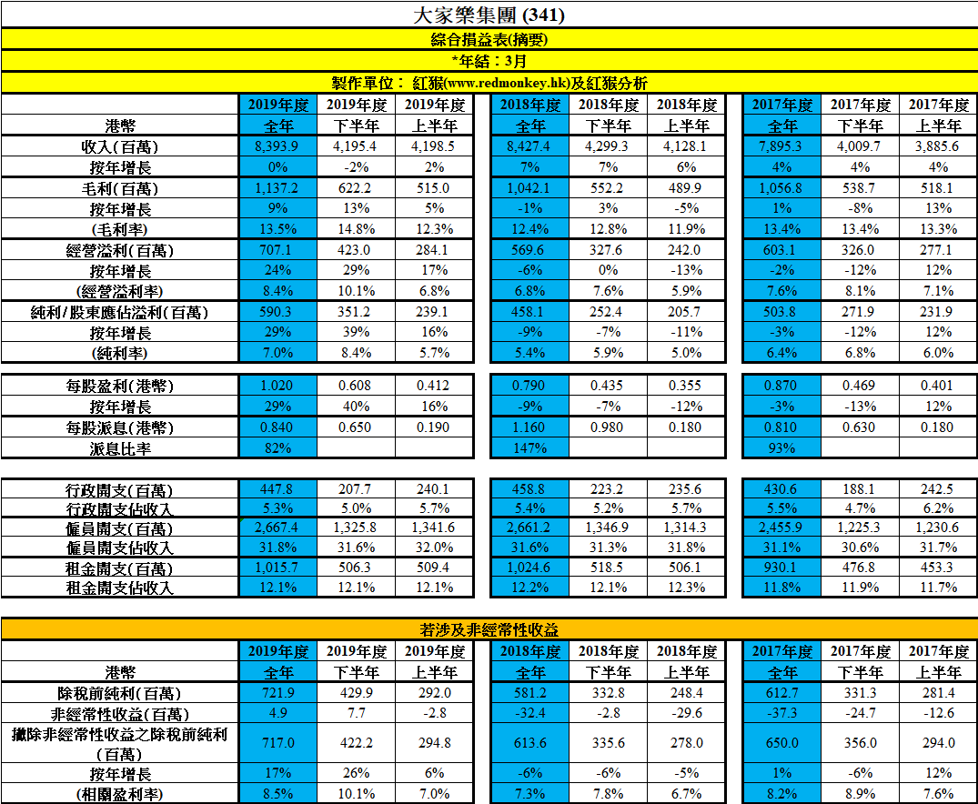 大家樂(341)是否增長股,收入過去數年還可緩慢增長,但至今年3月的去年度,收入只可按年持平,下半年更按年倒退,發生地還在主力的香港市場,相信源自開到通街都係的冰室/冰廳這些新版茶餐廳的競爭實屬不小。不過,管理層抵著越升越高的最低工資,做好成本控制,尤其是毛利率回復以往下半年響明顯較高的優良傳統,令每股盈利按年高升29%。不過,大家樂剛經歷連續三年的盈利倒退,而只較控制成本控換來的盈利上升未必有持續性,餐飲市場競爭數激烈下,我未夠信心大家樂的未來盈利仍可持續增長,所以不會視之為增長股。