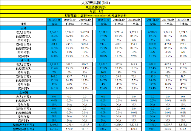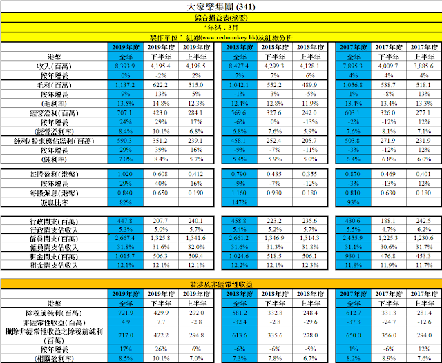 大家樂(341)是否增長股,收入過去數年還可緩慢增長,但至今年3月的去年度,收入只可按年持平,下半年更按年倒退,發生地還在主力的香港市場,相信源自開到通街都係的冰室/冰廳這些新版茶餐廳的競爭實屬不小。不過,管理層抵著越升越高的最低工資,做好成本控制,尤其是毛利率回復以往下半年響明顯較高的優良傳統,令每股盈利按年高升29%。不過,大家樂剛經歷連續三年的盈利倒退,而只較控制成本控換來的盈利上升未必有持續性,餐飲市場競爭數激烈下,我未夠信心大家樂的未來盈利仍可持續增長,所以不會視之為增長股。